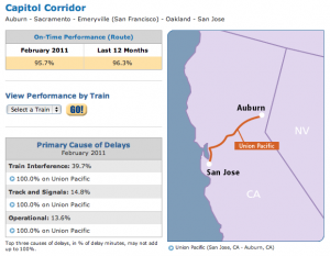 Take the Capitol Corridor. Last month, the Capitol Corridor trains averaged a 95.7% on-time performance. And that’s slightly down from the 96.3% on-time performance for the last twelve months.