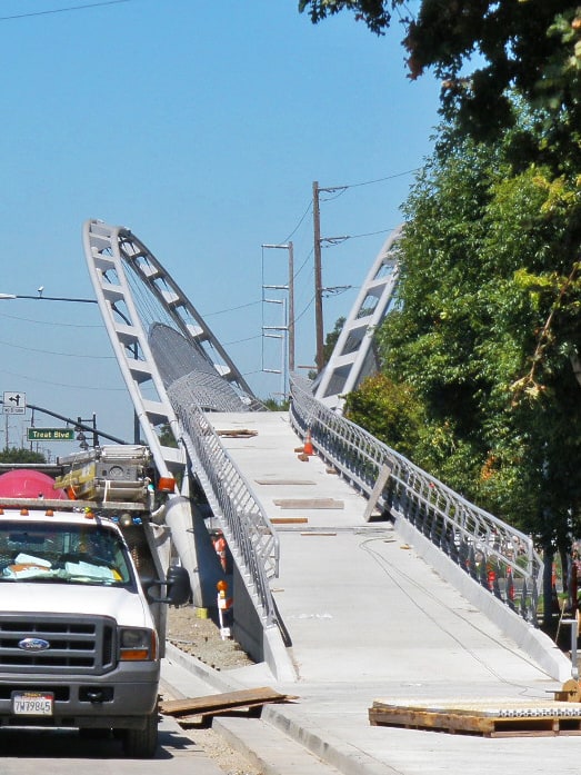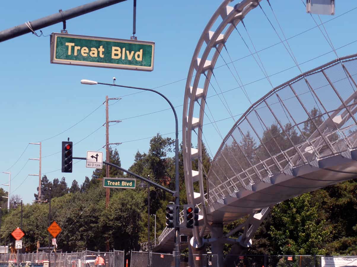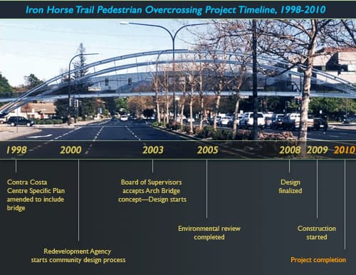 Construction on the $6.8 million bridge over the eight lanes of Treat Boulevard began in September of 2009 (see project timeline below). More than 1 million people per year use the Iron Horse Regional Trail, a 24-mile stretch from Dublin to Concord that runs along an old railroad right of way.