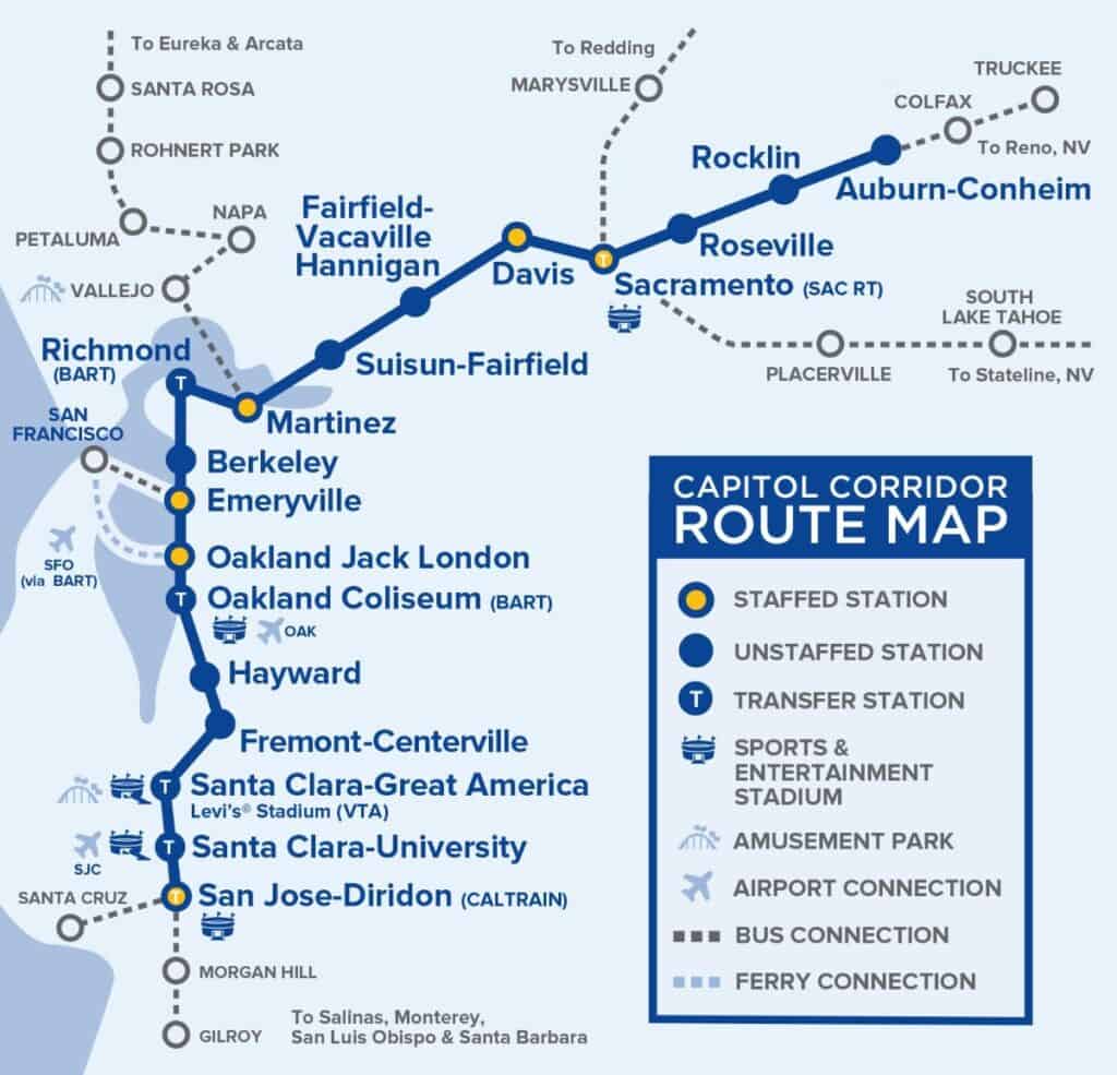 Capitol Corridor is an intercity passenger train system that provides a convenient alternative to traveling along the congested I-80, I-680 and I-880 freeways by operating fast, affordable intercity rail service to 18 stations in 8 Northern California counties. An extensive, dedicated motorcoach network provides bus connections from Capitol Corridor stations to cities including Gilroy, Santa Cruz, Napa, South Lake Tahoe, and Reno.