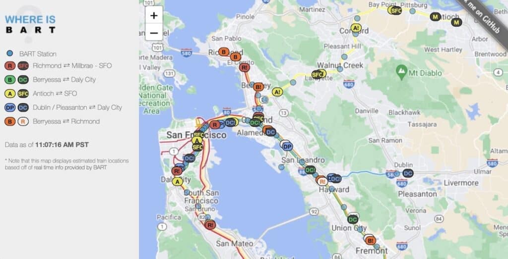 Where is BART? – A real-time visualization showing the locations of all BART trains, updated every 15 seconds.